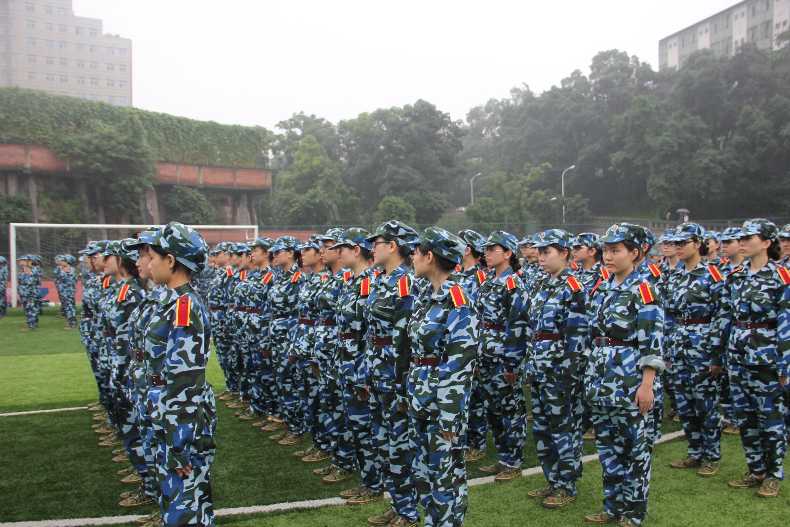 2014年7月1日,是2013级军训的第二天。今天,正是锻炼同学们毅力的一天!天气依旧时阴时雨,但与前一天不同的是,雨中的绿茵地上依然有同学们矫健的身影!雨水肆意的倾泻,打湿了草地,浸湿了迷彩服,冲刷着同学们的面庞。但是同学们依旧笔直的站立在风雨中,像一尊尊雕塑,更像战场上英勇的战士!同学们在同样身姿挺拔的教官的带领下,一遍遍的训练,一遍遍的重复着动作,没有丝毫怠慢与松懈。 常言道:古之立大事者,不惟有超世之才,亦必有坚韧不拔之志。在这里,同学们洒下了辛劳的汗水,收获的将是铁一般的体魄,刚一般的意志,雷厉风行的作风和坚定不移的毅力。