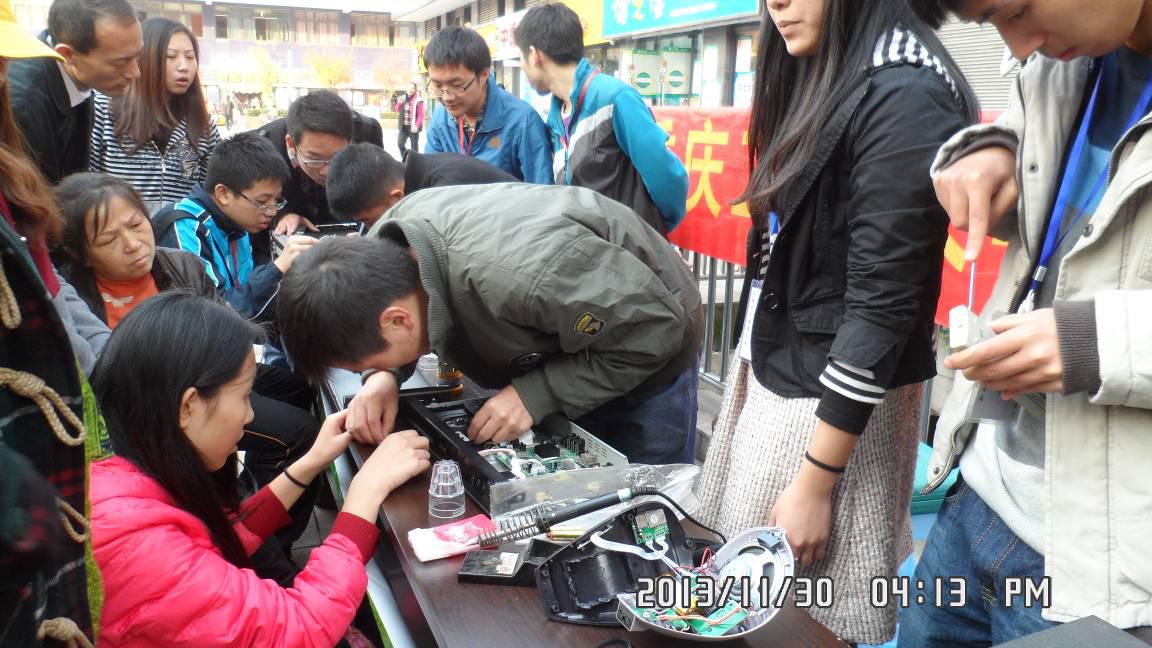 下午1:30各部门人员在香樟林集合,1:40各部门各派的部长或干事先到渝能国际向物管借桌子,2:00会长、部长和干事拿着维修工具到渝能国际。2:30宣传部开始拉“MK体育家电维修协会”横幅并派人员到各个小区进行宣传义务维修活动。居民们纷纷拿着需要维修的物品下来修,如电饭锅、电磁炉、电风扇、电吹风、电脑、音箱和插线板等。会长、部长和干事们都动起手来修东西。在家协人的努力下,很多件待修物品都被我们修好了。旁边围观的居民越来越多都对我们表示赞同和感谢。有的人还问我们下次什么时候再去。5:30我们该去还桌子了,可那时拿东西来维修的人还没有断,我们把桌子还了之后又在旁边的椅子上继续为居民维修。6点,我们完美的结束我们的这次维修活动。家协人在回来的路上分享了维修经验。