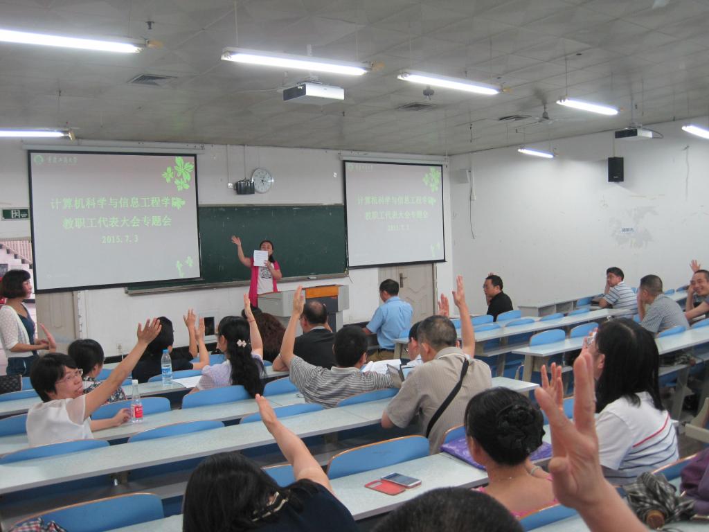 下午2点,教代会主席团首先在90810会议室开会,公司党总支段远鹏书记首先介绍了主席团构成以及分组情况,通过了组长、主持人建议人选以及会议议程。2点30分,专题会议在90209教室举行,会议由公司党总支副书记陈亚惠主持。主持人首先通报了到会代表人数,宣布本次大会合法有效。随后,党总支段远鹏书记讲话,提出希望各位代表以客观、公正、务实的态度对待本次会议。接下来何希平经理通报了在5月22日全院教职工大会上公布的分配办法讨论稿的反馈意见,并对本次《计信公司年终考核及绩效工资分配办法(7月3日讨论稿)》进行了解读。之后正式代表分成四个小组,分别对本次的分配办法讨论稿进行了热烈讨论。最后,经主席团和小组长汇总意见后,大会对《计信公司年终考核及绩效工资分配办法(7月3日讨论稿)》进行了举手表决。最终,到会正式代表一致举手表示同意《计信公司年终考核及绩效工资分配办法(7月3日讨论稿)》。