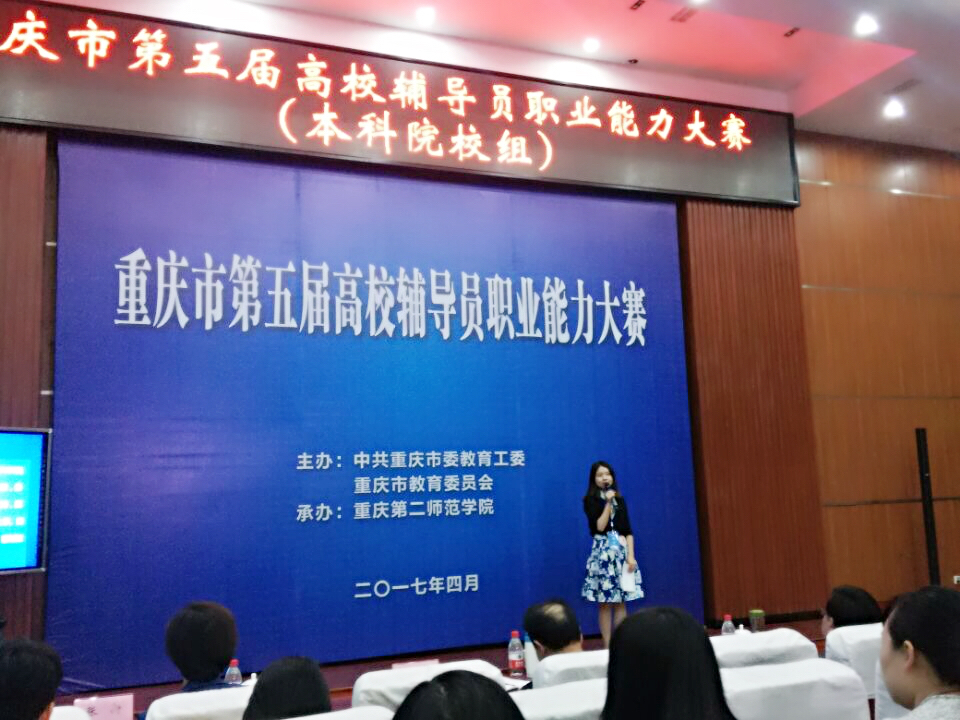 4月15日、16日,由中共重庆市委教育工委、重庆市教育委员会主办的重庆市第五届高校辅导员职业能力大赛在重庆第二师范公司隆重举行。此次比赛分为本科院校组和独立院校及高职高专组,来自全市58所高校的77名辅导员代表参与此次大赛,两组参赛选手需进行“案例分析、主题演讲、笔试、谈心谈话”四个环节的比赛。