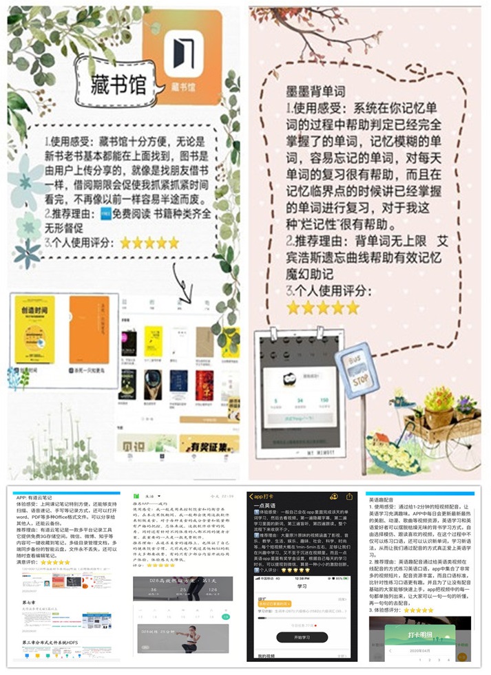 此次活动得到了同学们的积极响应,大家一边进行线下APP体验,一边通过QQ群、QQ空间等渠道开展线上分享,并在10天活动期内完成了7天以上的体验打卡。活动中,不仅计信党服推荐的6款宝藏APP得到同学们的青睐,更有不少同学打卡安利出了个人的收藏款APP。参与同学纷纷晒出体验打卡笔记,为推荐的APP评分。据统计,本次活动中同学们打卡、体验APP 共计81款,内容涵盖时间管理、外语学习、运动健身、历史人文等多个方面。