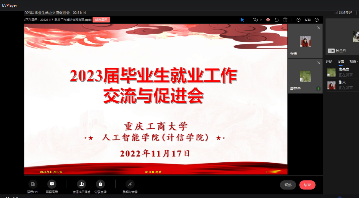 新冠肺炎疫情迁延反复使得我国高校毕业生就业形势更加严峻,对我国“稳就业”工作带来了巨大挑战。为贯彻“三全”促进毕业生就业创业的工作要求,2022年11月17日19时,MK体育在线上举办了勇往“职”前——2023届毕业生就业工作交流与促进会。公司党委书记何希平、经理唐亮贵、党委副书记张未、副经理杨光详、副经理秦华锋、就业联络员孙金兵、各专业教师、毕业班辅导员和2023届全体毕业生参加了本次会议,与会师生对当下的就业前景和状态分别进行了交流发言。