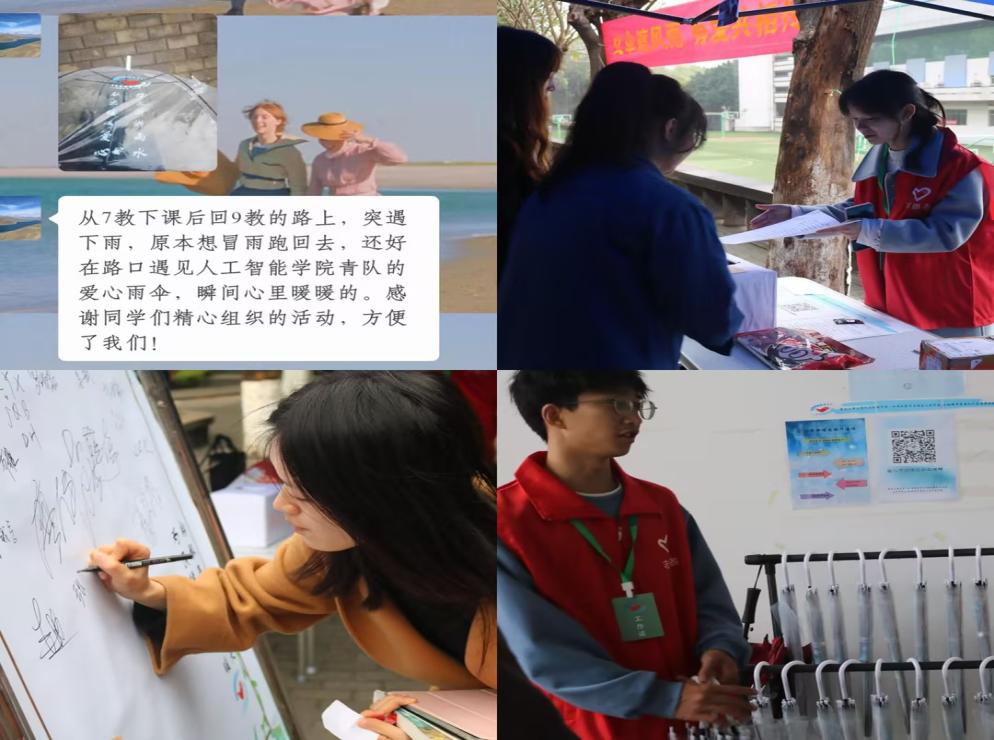 此次活动,不仅帮助同学们解决了“突遇雨天,忘带伞”的难题,体现了老员工自我管理和服务的能力,同时也提高了大家的诚信意识,营造了良好的文明校园氛围。
