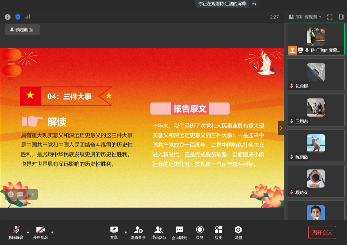 通过对党的二十大报告中关于实施科教兴国战略、强化现代化建设人才支撑、坚持全面依法治国、扎实推进共同富裕、推进国家安全体系和能力现代化、开创国防和军队现代化新局面、坚持和完善“一国两制”,推进祖国统一、推动构建人类命运共同体八个方面内容的学习体会分享,与会同学充分理解到党在未来将继续带领全国人民奋斗的方向和将持续付出的努力。