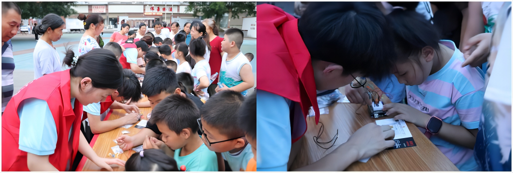 从课堂中有所学,在实践中有所用。社会实践团成员深刻重视实学实干,践行知行合一,在向孩子们讲授一定编程基础知识后,在西沱镇政府广场举行Arduion积木编程培训,引导孩子们通过运用电子元器件,搭建自制风扇,再将Scratch上编写的代码传入芯片,实现风扇的转动。在实践中,孩子们初步认识嵌入式编程,激发编程兴趣,培养解决能力的思维和独立思考的意识,让求知创新,知行合一的精神在孩子们的心中种下种子。