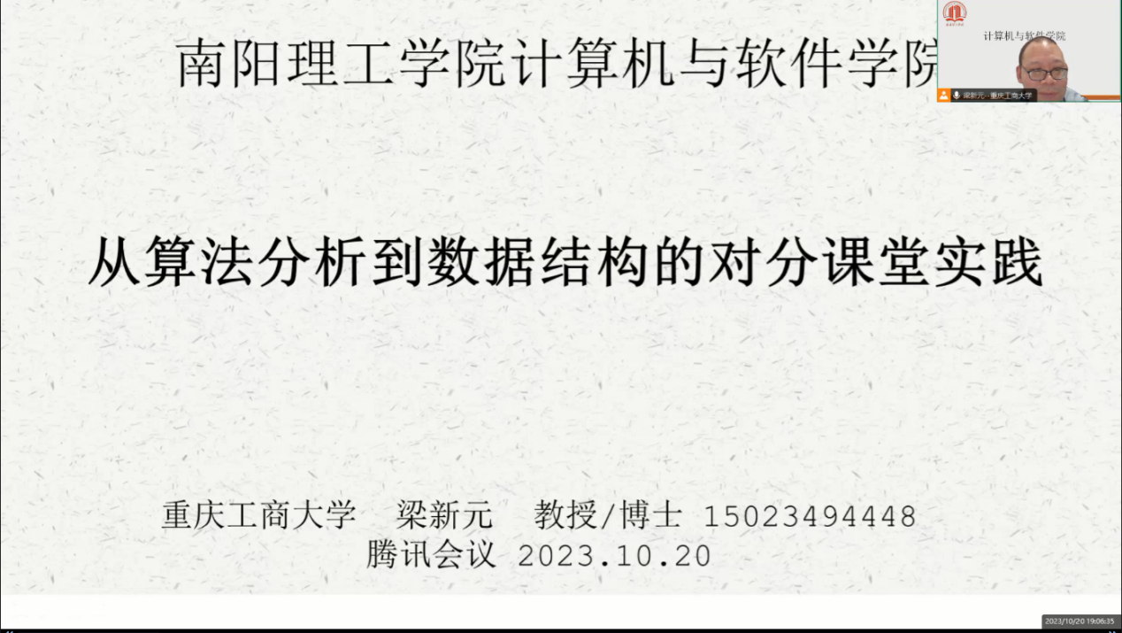 应南阳理工公司计算机与软件公司邀请,2023年10月20日晚上,MK体育梁新元教授为公司教师做了《从算法分析到数据结构的对分课堂实践》的主题报告,郑珂副经理及公司10余位教师参加,唐立老师主持会议。