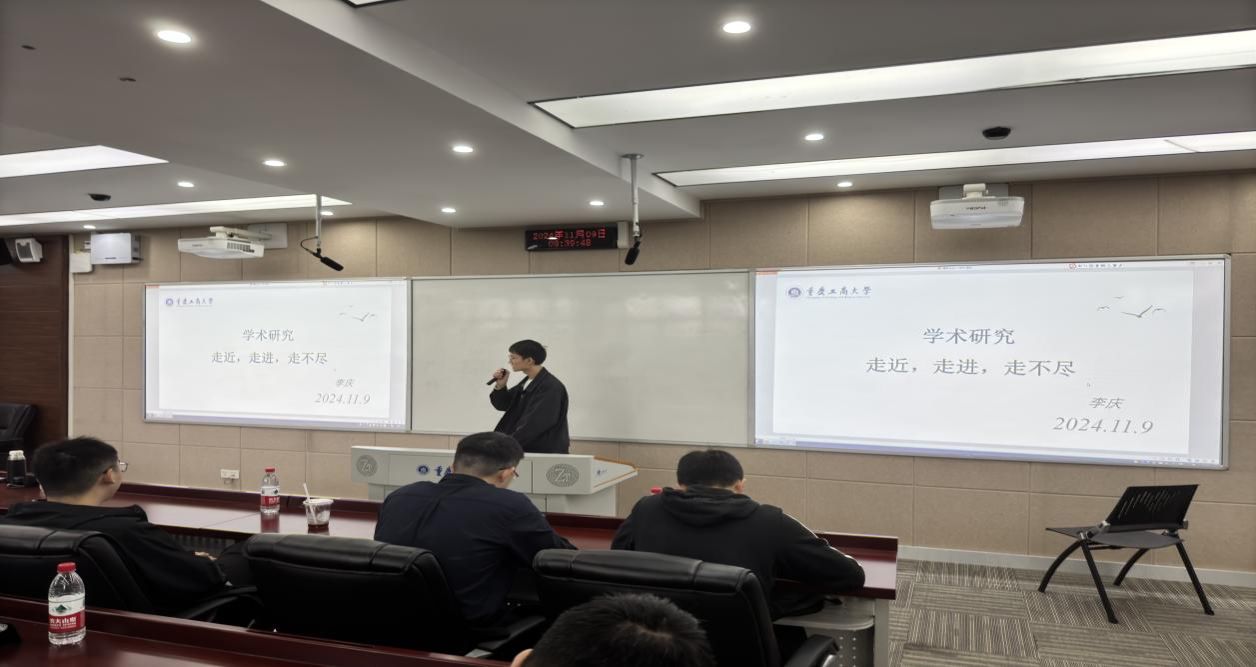首先登台的是李庆同学,他以“研究经验与感悟”为主题,从自身科研经历出发,向大家分享了科研道路上的宝贵经验。他的演讲提纲包括研究经验与感悟、文献阅读与管理、科研工具的使用以及对同学们的寄语。在最后,李庆同学引用“追风赶月莫停留,平芜尽处是春山”鼓励同学们勇敢追梦,勇攀科研高峰。
