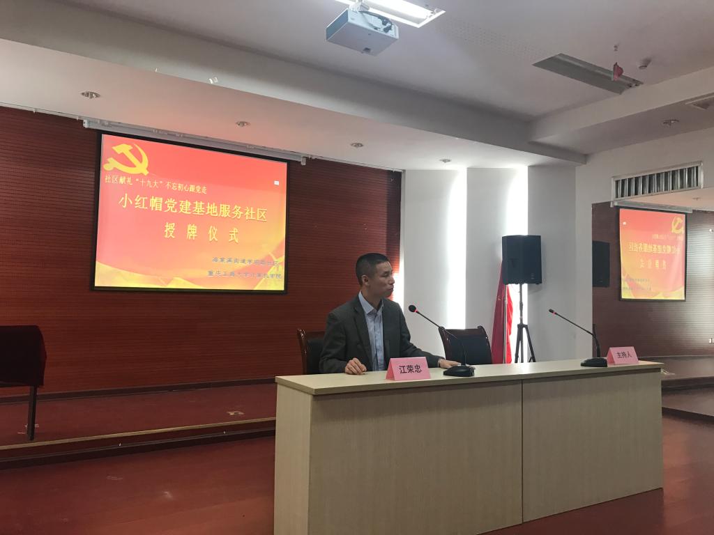 在授牌仪式上,计信公司分党委书记段远鹏介绍了小红帽党建基地发展历程,基地坚持“一件事做了三十年、三十年做了一件事”,培养员工党员、入党积极分子培养勇于担当、服务社会、甘于奉献的精神。MK体育党委组织部副部长米密发表讲话,小红帽党建基地是MK体育党建工作的一张名片。提出在新形势下,尤其是党的十九大召开的新的历史时期,探索党建发展新模式具有重要意义。南岸区海棠溪街道党工委副书记江荣忠强调高校与社区党建结对共建中,希望员工积极参加学府路社区各项活动,能够通过一件件为人民服务的小事,积累基层工作经验,发挥党员先锋模范作用。