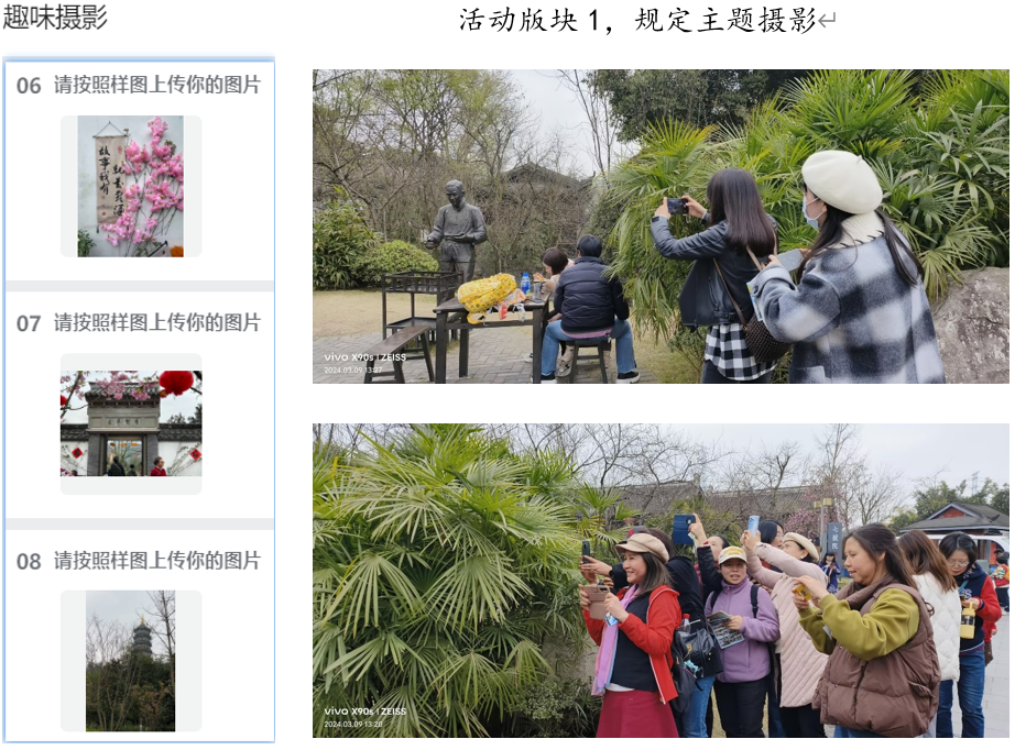 活动分两个部分,第一是规定部分,参赛者需要在自然环境中找到题目中8个场景,拍摄尽量相似的照片,自选两个场景拍摄者本人出镜,拍摄的图片通过企业微信收集表收集,锻炼参赛者敏锐的观察能力。第二个部分是自选主题,可以展现自然之美,也可以展现人物肖像或者文化多样性,提高审美素养。