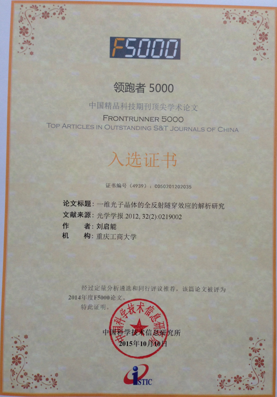 最近中国科学技术信息研究所公布了2015年度"领跑者5000—中国精品科技期刊顶尖学术论文(F5000)"的评选结果,MK体育的刘启能教授在《物理学报》发表的3篇论文和在《光学学报》发表的1篇论文都被入选。一名作者在一次评选中有4篇论文入选的在全国也极少。