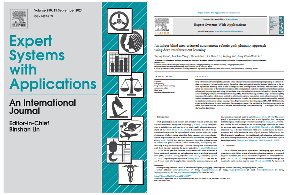 公司公司硕士研究生周雨婷在机器人自主路线规划方面取得了新进展,研究成果“An Indoor Blind Area-Oriented Autonomous Robotic Path Planning Approach Using Deep Reinforcement Learning”(面向室内盲区基于深度强化学习的机器人自主路径规划方法)在智能系统领域国际知名期刊《Expert Systems With Applications》(中科院1区Top)在线刊出(DOI:10.1016/j.eswa.2024.124277)。