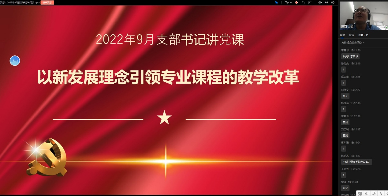 组织生活第二阶段为支部书记讲党课。支部书记李明同志以“以新发展理念引领专业课程的教学改革”为题做了专题党课。在专题党课中,李明分别从以新发展理念引领专业课程的教学改革、专业课程教学改革以创新发展为驱动、以协调发展实现有机统一三个方面进行讲解。李明指出,对于专业课的教学要创新教学内容、教学模式和教育思维,同时注重课程的系统性、融合性和延续性。李明强调,创新、协调、绿色、开放、共享的新发展理念,是管全局、管根本、管长远的导向,具有战略性、纲领性、引领性、新发展理念相互贯通相互促进,是具有内在联系的集合体,要统一贯彻,不能顾此失彼,也不能相互替代。对于高校专业课教学改革而言,在创新发展和协调发展的基础上,还要贯彻好绿色开放和共享的发展理念,三者综合起来便是要突出人的核心地位,体现以员工为中心的发展思想。