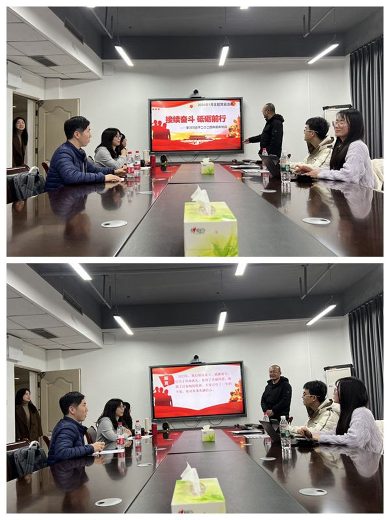 组织活动的第二项内容为主题党日活动。本月主题党日活动的主题为“接续奋斗 砥砺前行”,李明领学了习近平同志二〇二四年新年贺词,他从“不凡成就 振奋人心”、“攻坚克难 勇毅前行”和“凝心聚力 再谱新篇”三个方面借助新年贺词中十七个金句,带领大家回顾了习近平同志新年贺词的主要内容。李明指出,习近平主席的新年贺词温暖信息、催人奋进,激励亿万人民把光荣和梦想书写在强国建设、民族复兴伟业的新征程上。