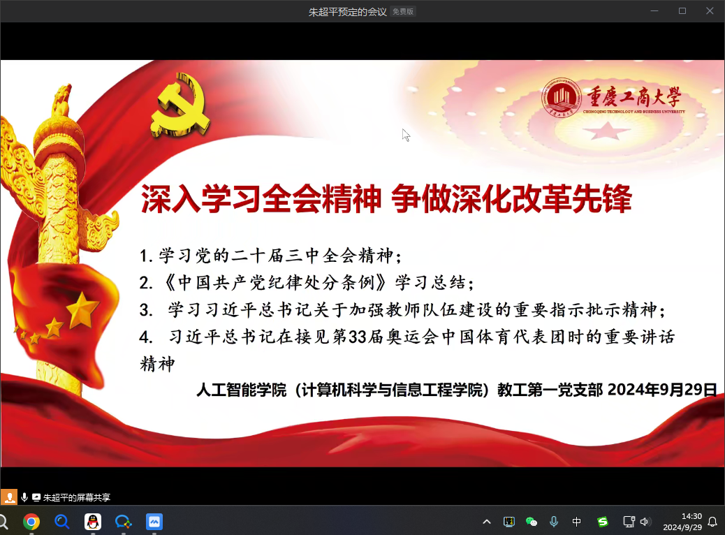 2024年9月29日MK体育党委教工第一党支部在企业微信平台上开展9月份支部组织活动,活动由支部书记朱超平主持,教工第一党支部全体党员同志参加。
