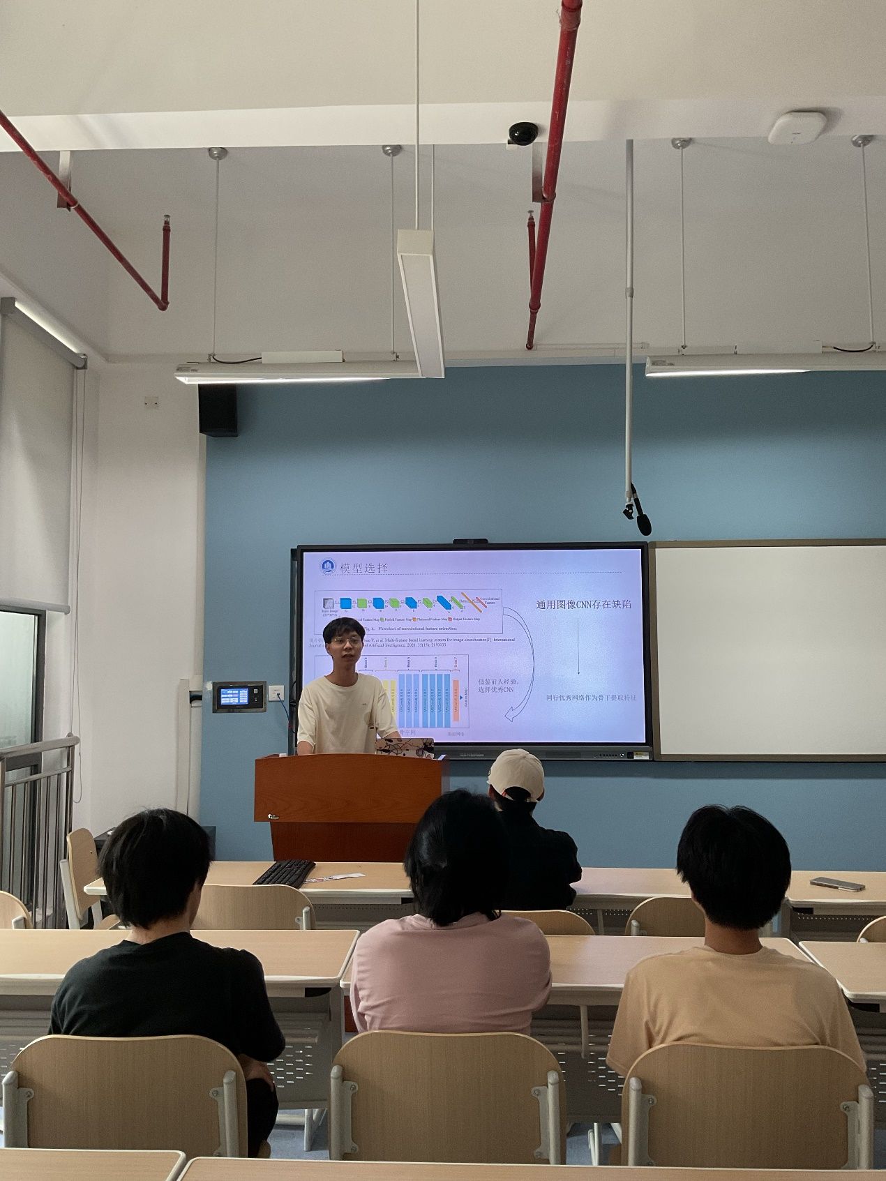 随后,2022级人工智能专业本科生万辉同学,深入分享了课题研究的代码实践过程。他详细阐述了模型选择、网络架构设计、特征提取以及模型融合等关键步骤,并分享了宝贵的模型调参经验,为同学们提供了丰富的实践指导。