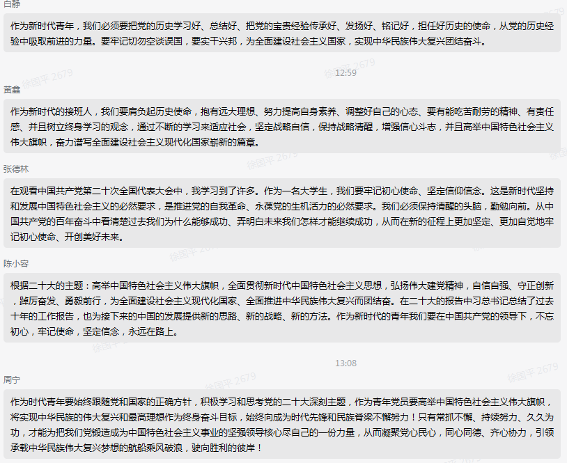 支部书记徐国平表示:习近平总书记的报告振奋人心。作为新时代的教育者,要肩负历史使命,怀抱远大理想、努力提升自身素养、发扬吃苦耐劳与责任担当精神,为党育才、为国育才,以实际行动肩负起高校育人神圣职责与使命,为中华民族伟大复兴事业提供源源不断的人才支撑,奋力谱写全面建设社会主义现代化国家崭新的篇章。