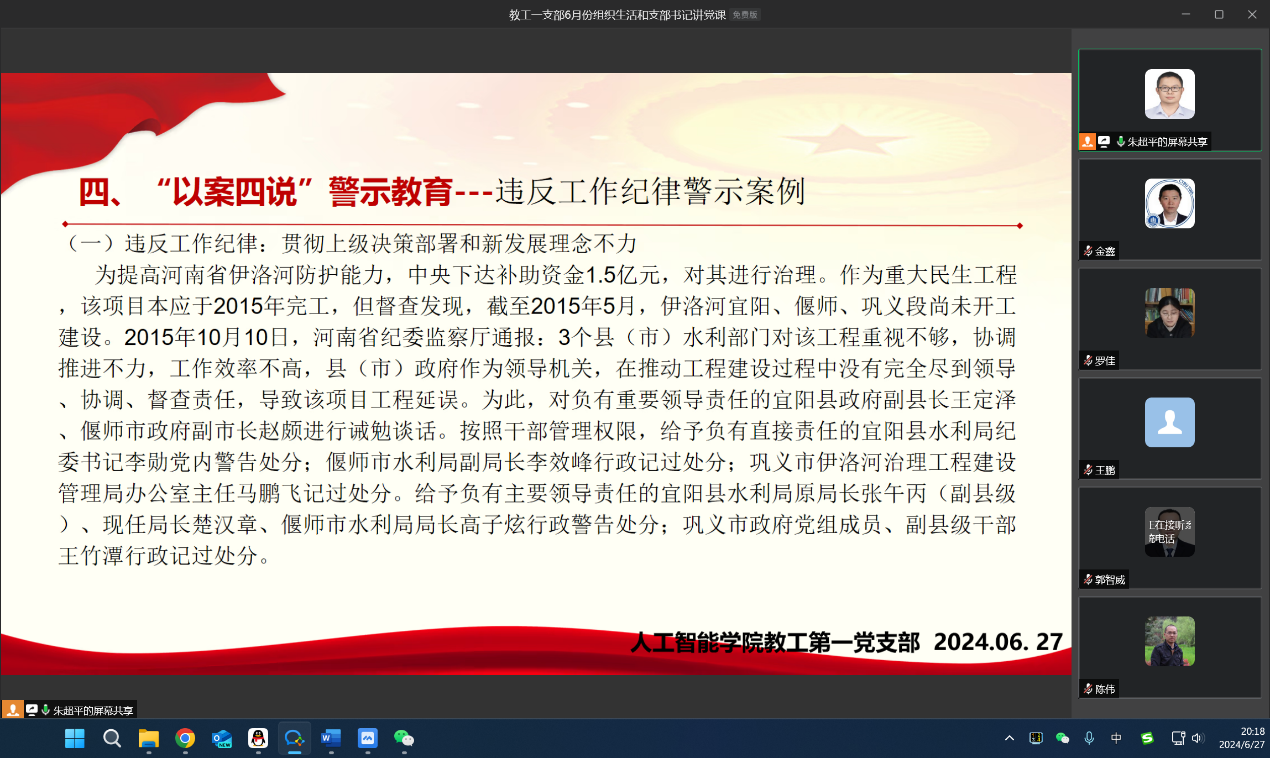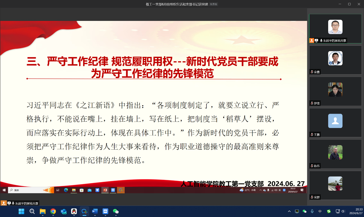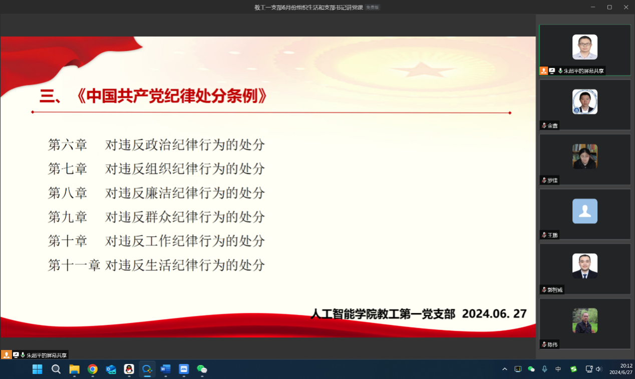 在组织生活的第三阶段,支部书记朱超平带领支部党员认真学习了中国共产党纪律处分条例,认真学习了条例第一百三十条至一百四十一条,并在组织生活第四阶段以生动警示案例强调纪律在心、警钟长鸣的重要性。
